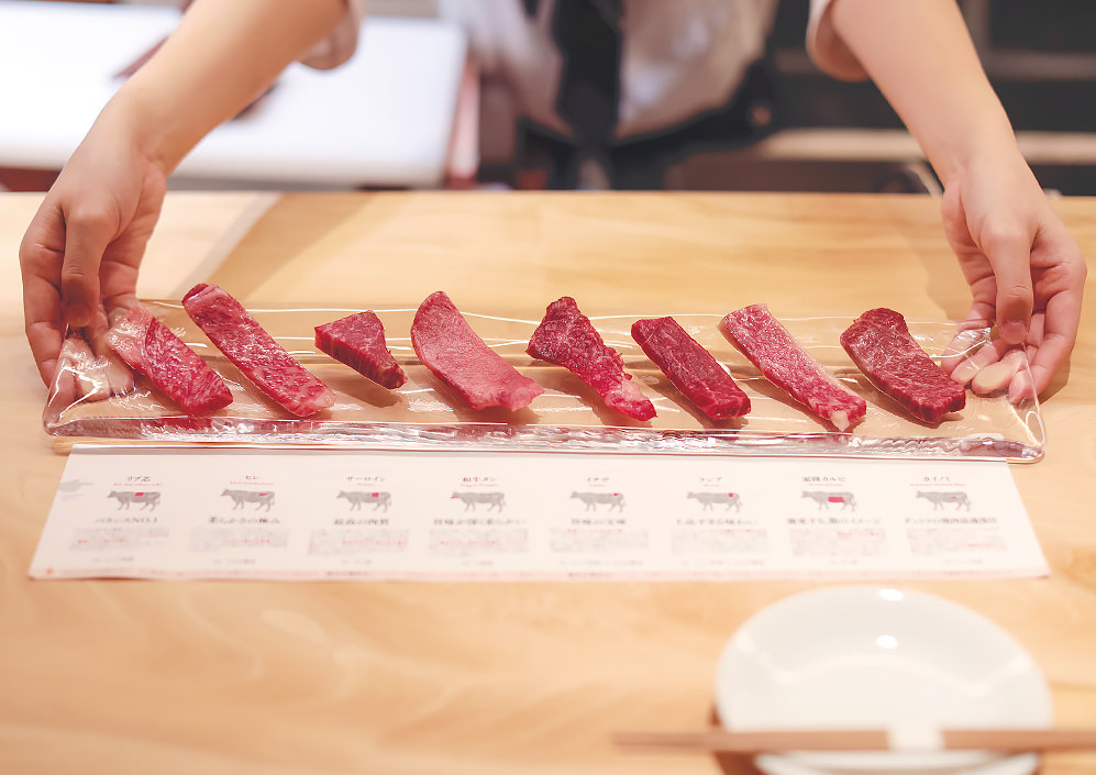 8種の部位を1切れずつ楽しめるセット。部位ごとに薬味を指定しているだけでなく、食べる順にもこだわり、左から順に食べていただきます。専用の肉紹介シートもついて処女牛の虜になること間違い無しです。