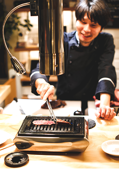 お客様の目の前で、肉をカットするところから、焼き上げるまで焼肉ひとすじ20年の店主自らが行います。部位ごとに肉の紹介、小話があり処女牛の美味しさだけでなく、店主の肉に対する愛情にも圧倒されます。